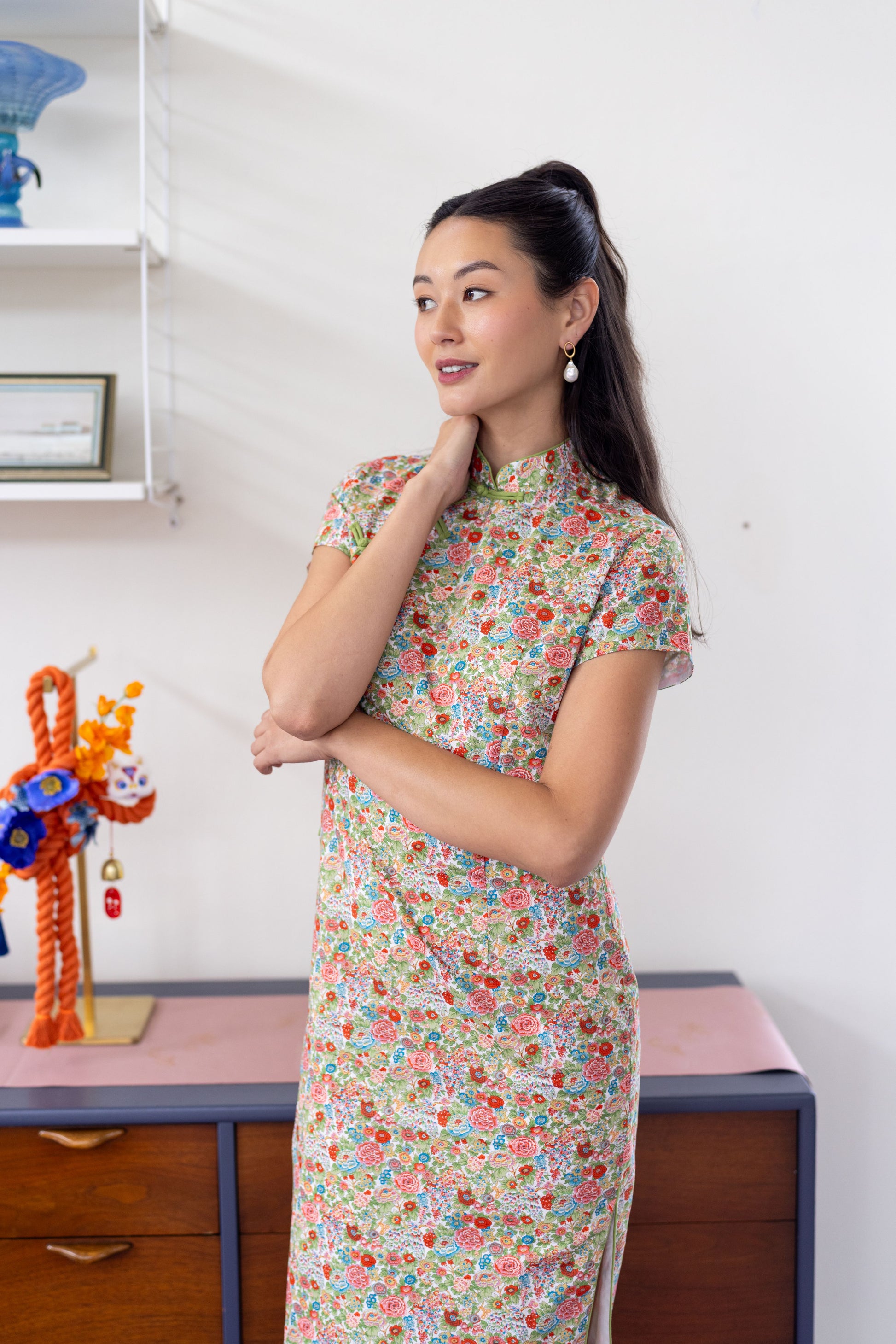 A modern, dress-up interpretation of the classic cheongsam, designed in a shorter silhouette for easy, elegant wear. The clean mandarin collar and fitted shape flatter the figure, while the streamlined length keeps it light and versatile. This is a piece we loved from first sight—timeless, refined, and unmistakably Bochechas DNA.
