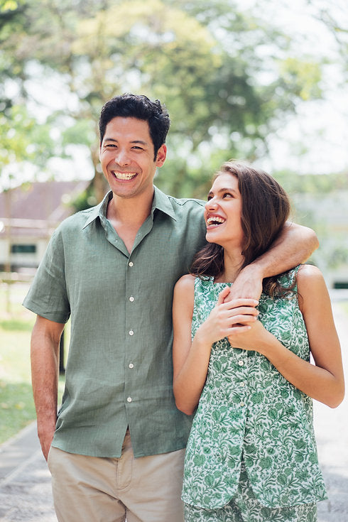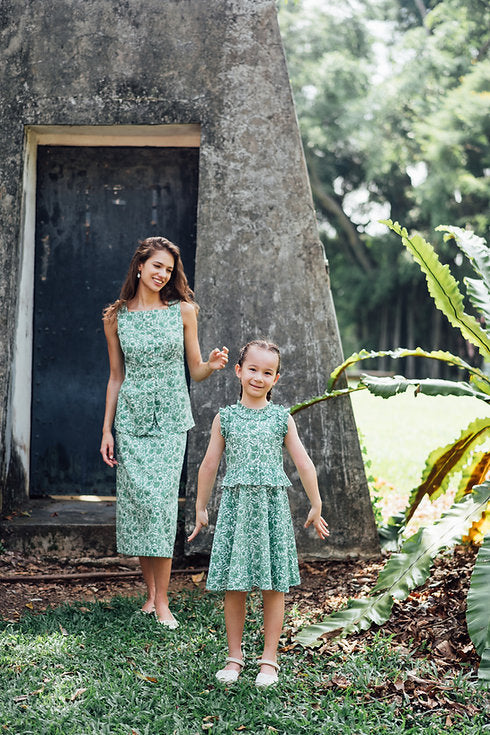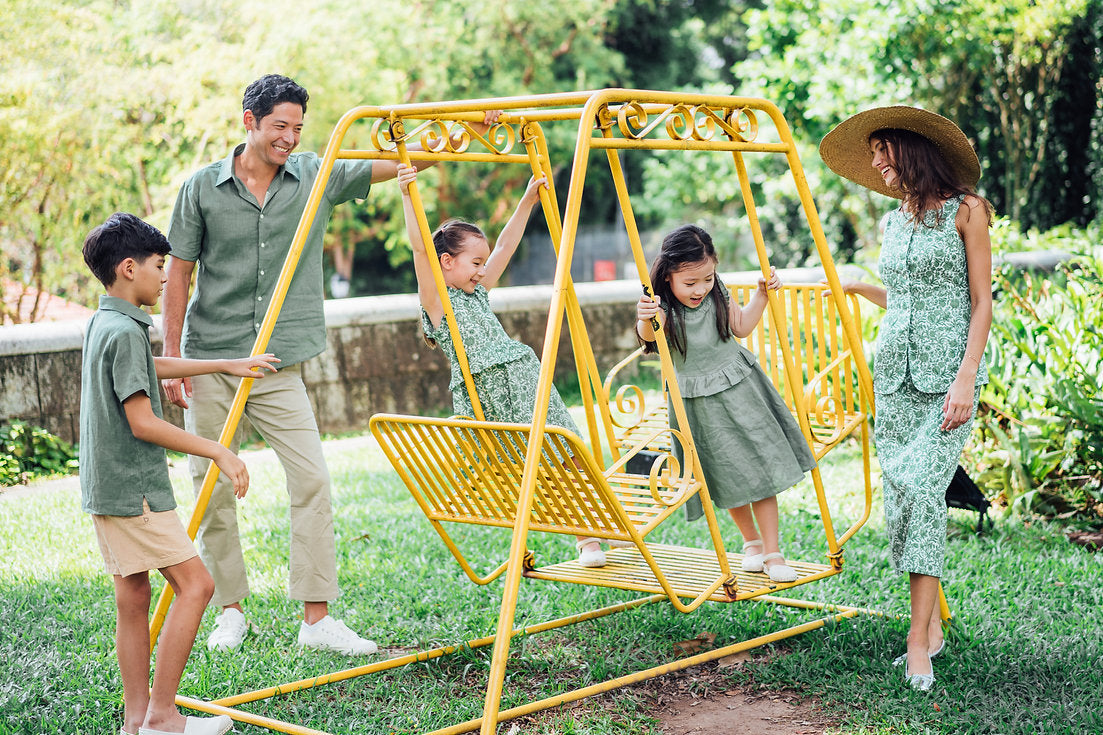 Also available in plain linen moss green color, it comes with matching hair pieces, and coordinated styles for girls, and baby girls.