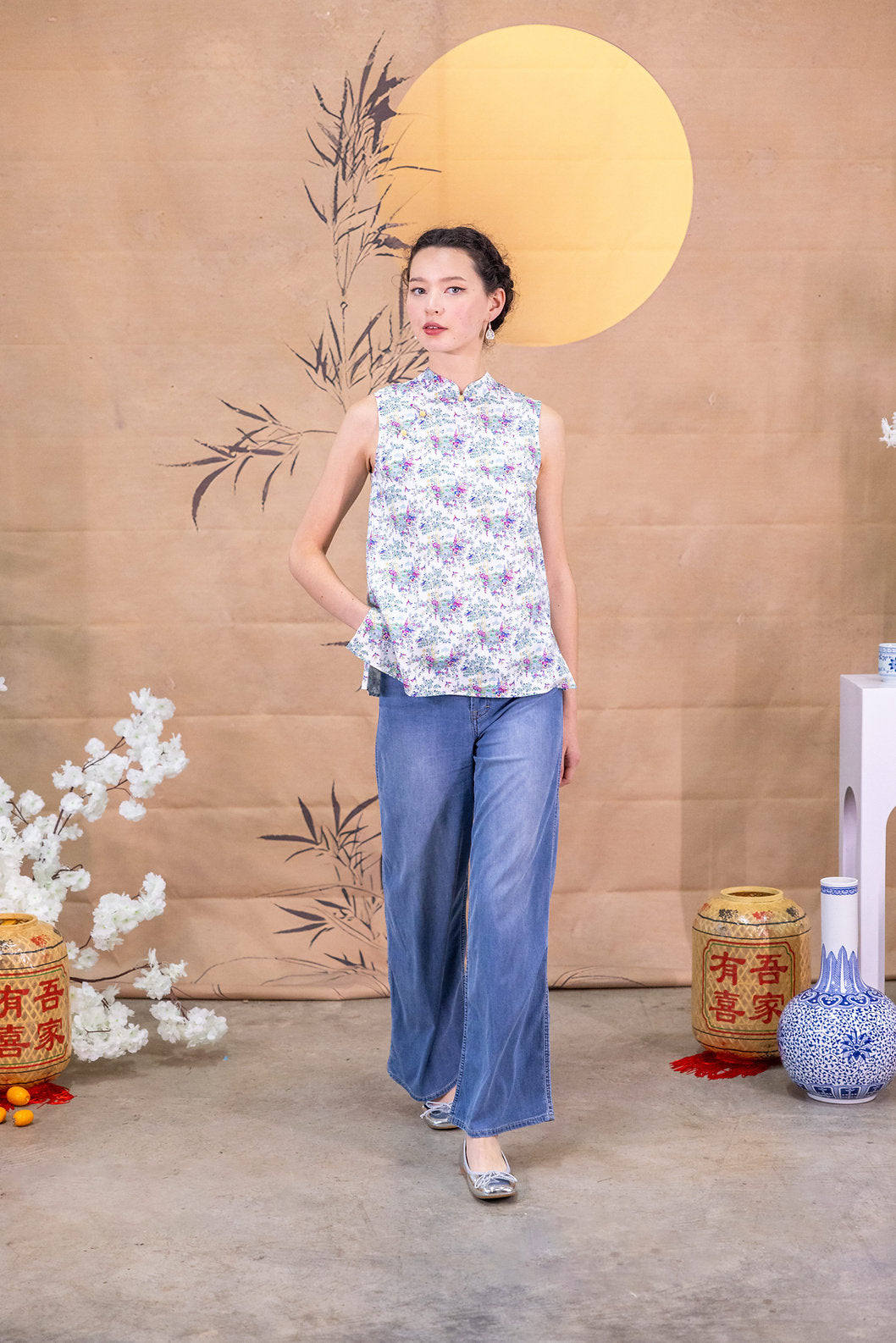 This lady's top features a flower-shaped yellow jade button, and ribbon detail at the back. Mini side slits allow easy movement, pair it with jeans or shorts or even skirts for a young and playful look. Ideal for Lunar New Year or any festive occasion.