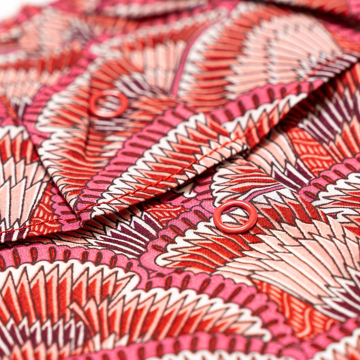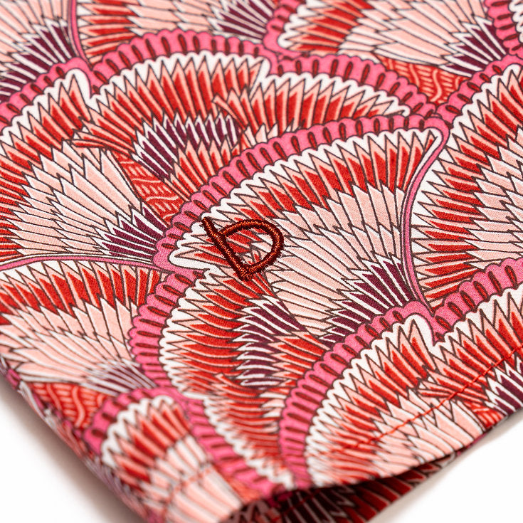 The wing-like shapes of this immersive pattern almost seem to rise and unfold in unison, creating a complex choreography of form. Referencing the classical myth of Icarus, the design was derived from an archival Liberty piece from the late 1980s, with each element meticulously redrawn to retain the intricate linework of the original..