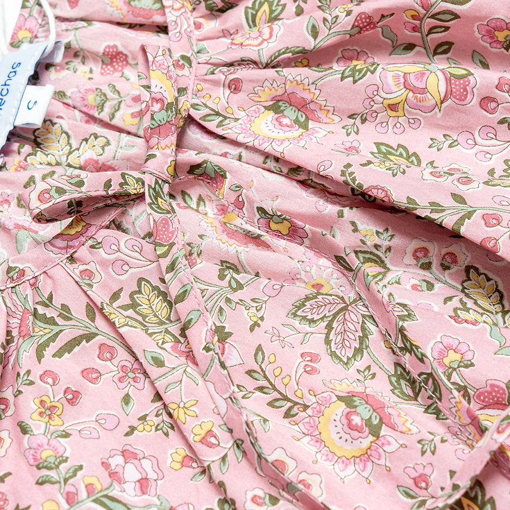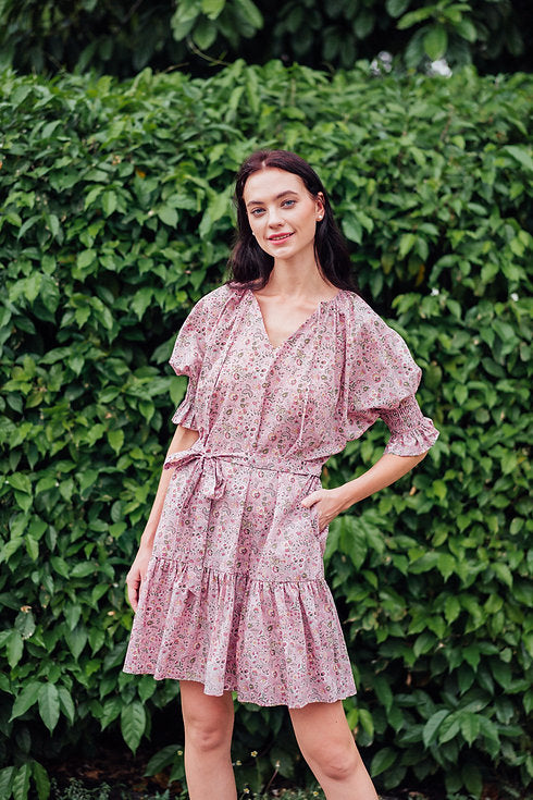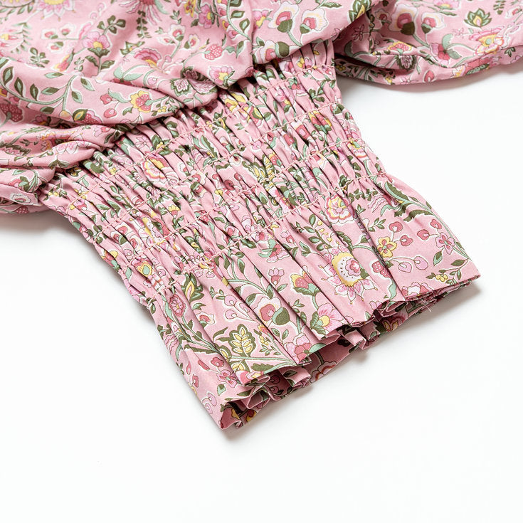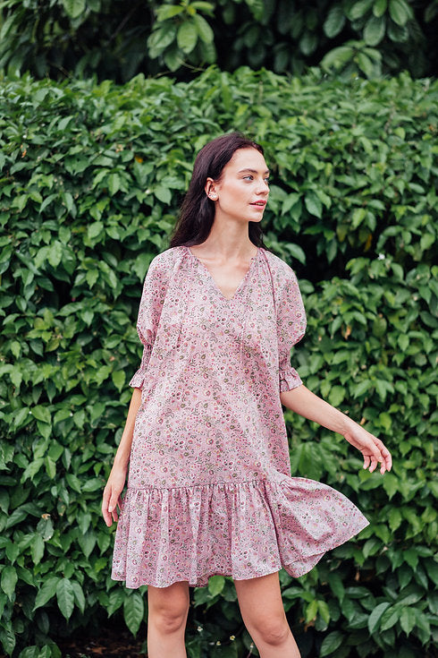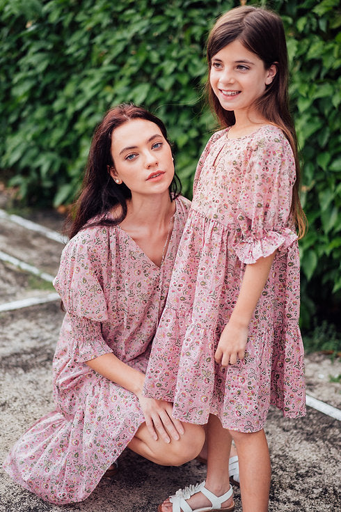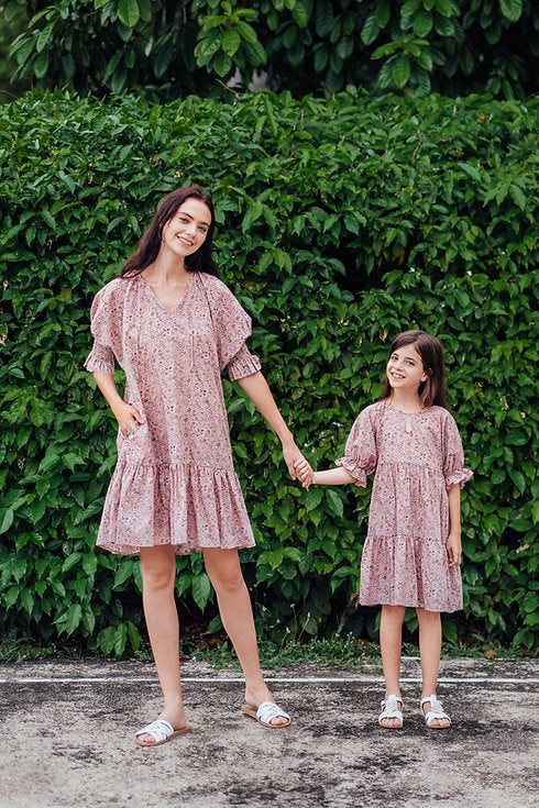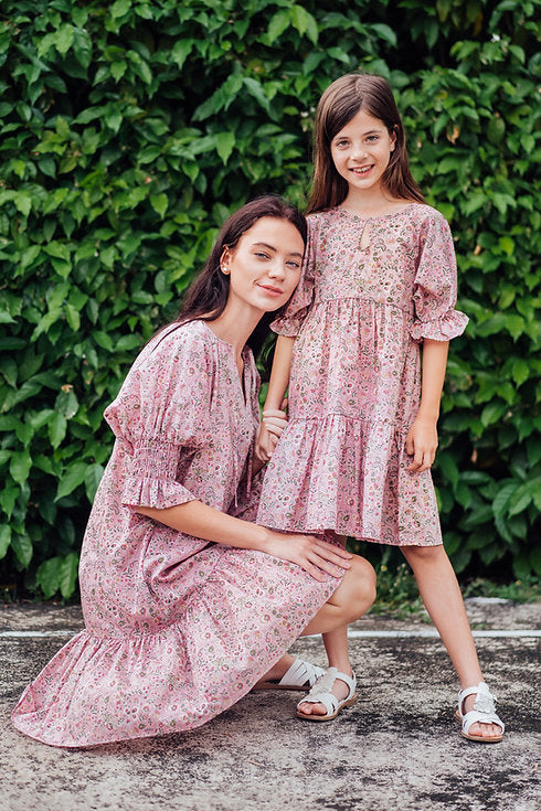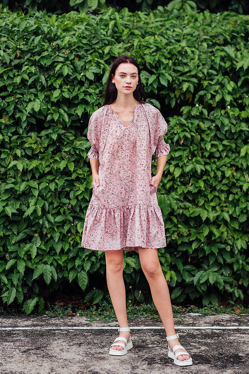 An effortless chic piece made with Liberty Tana Lawn™ Kazusa print, features a loose cut tiered dress, split neckline, and 3/4 puff sleeves with elastic cuffs.