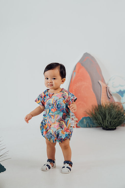 It is a unisex design for either baby girl or baby boy, featuring a round collar, a set of decorative hand-made knot buttons, and snap button fastening in the back and at the bottom. It is cut in loose style to allow active babies to move around comfortably, it is the perfect onesie for stay home or going out.
