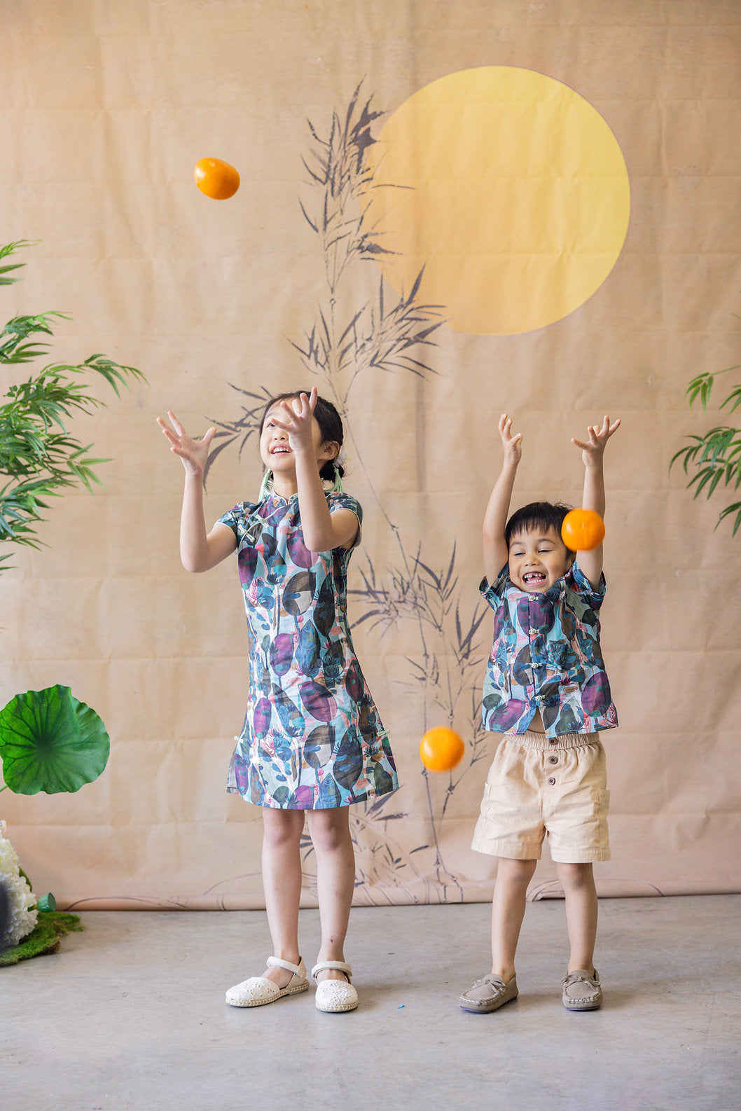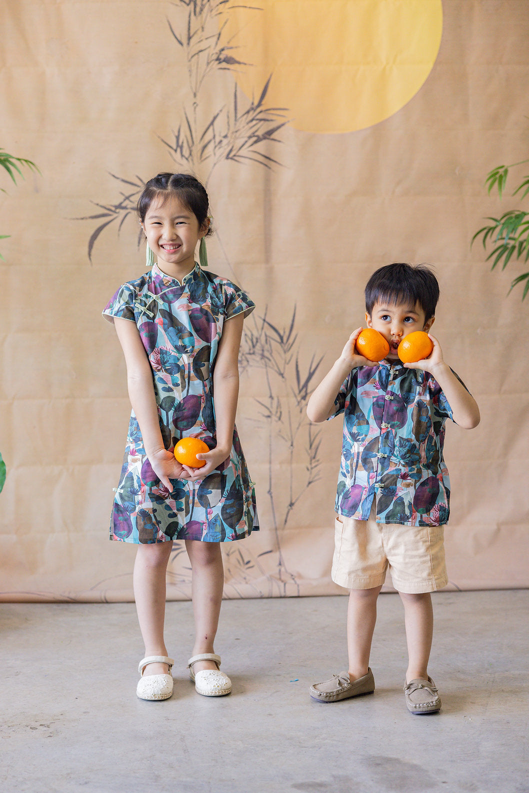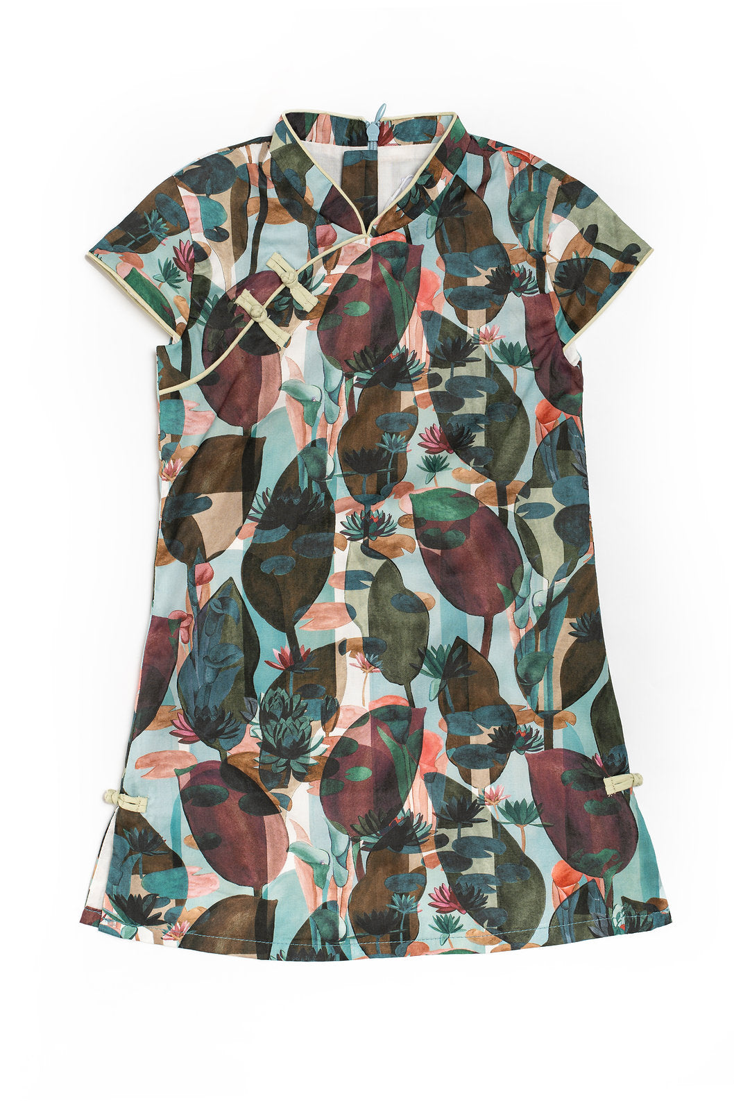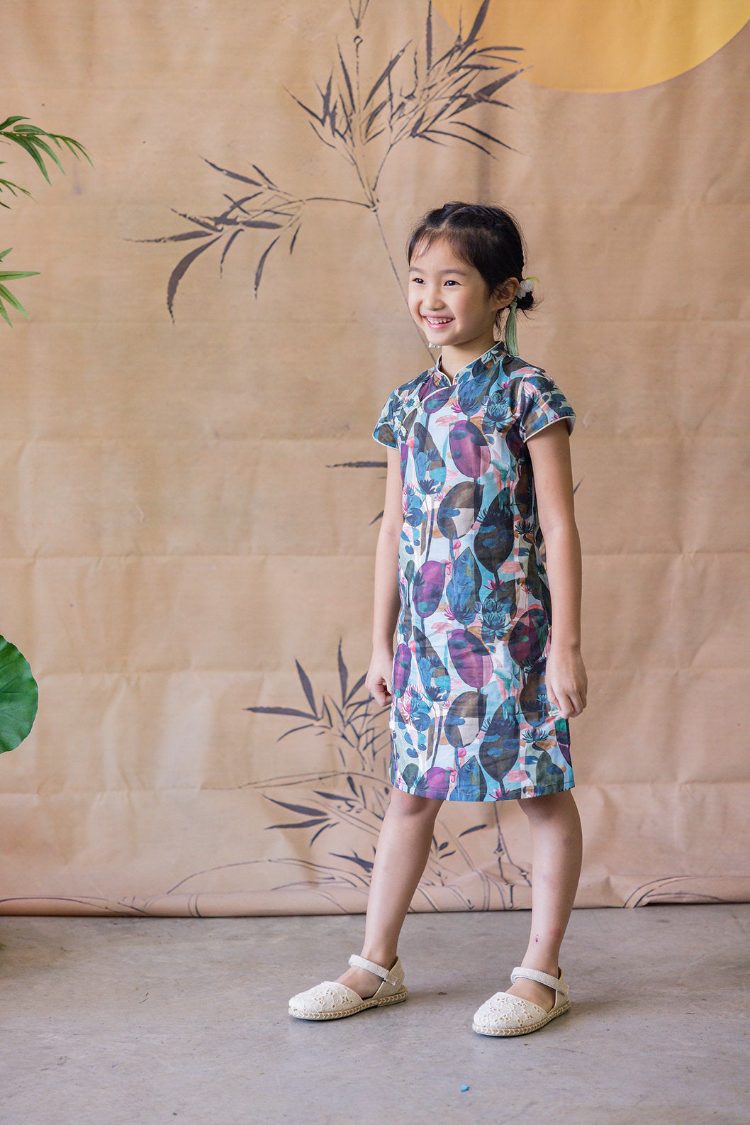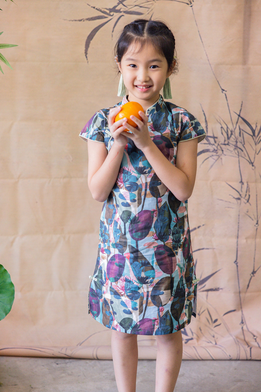 The Lotus Cheongsam is made with Liberty Tana Lawn™, fully lined with 100 thread count cotton to allow maximum breeziness, tailored with a comfortable A-line cut and side slits for the girls to move around with comfort and style. All Chinese knot buttons are hand made, and it closes with YKK zipper in the back.