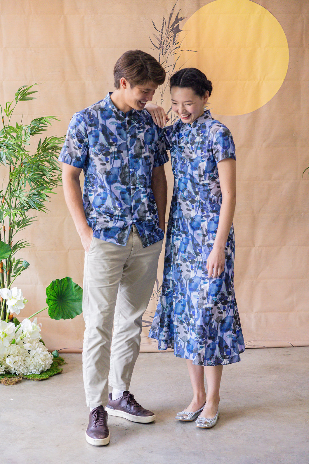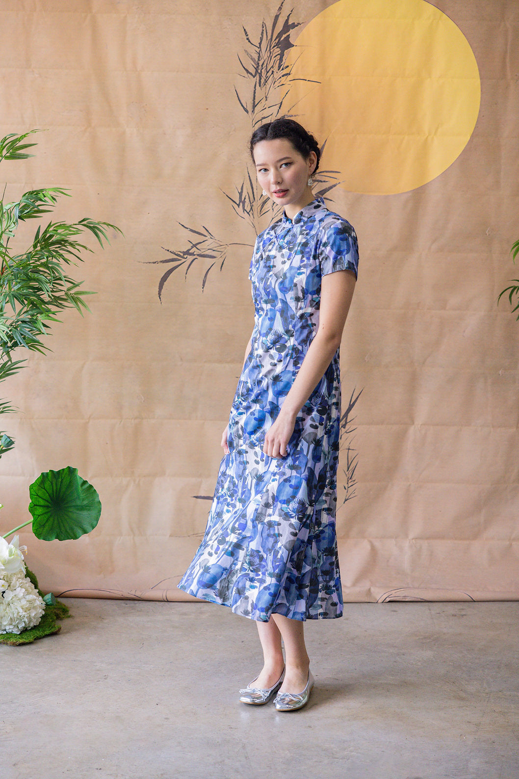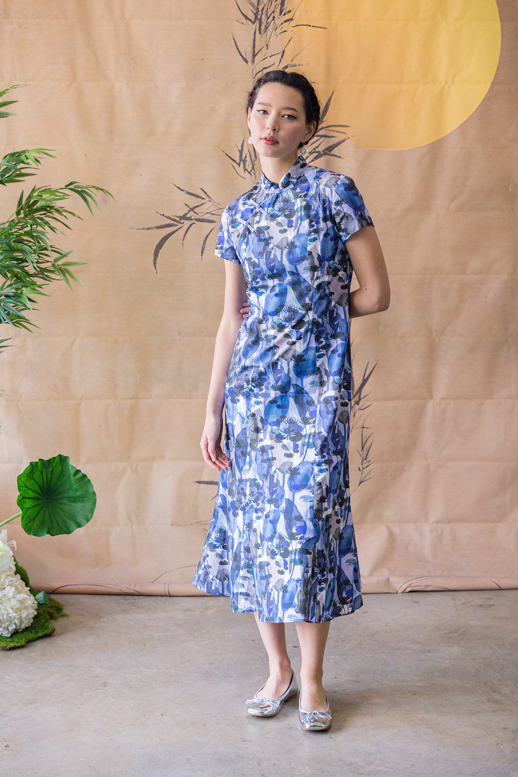 This eye catching lady’s cheongsam is available in three color ways, featuring impeccable handmade Chinese knot button details, small mermaid flare, and a midi lenghth give the piece a glamorous look. Whether for festive gatherings or grand celebrations.