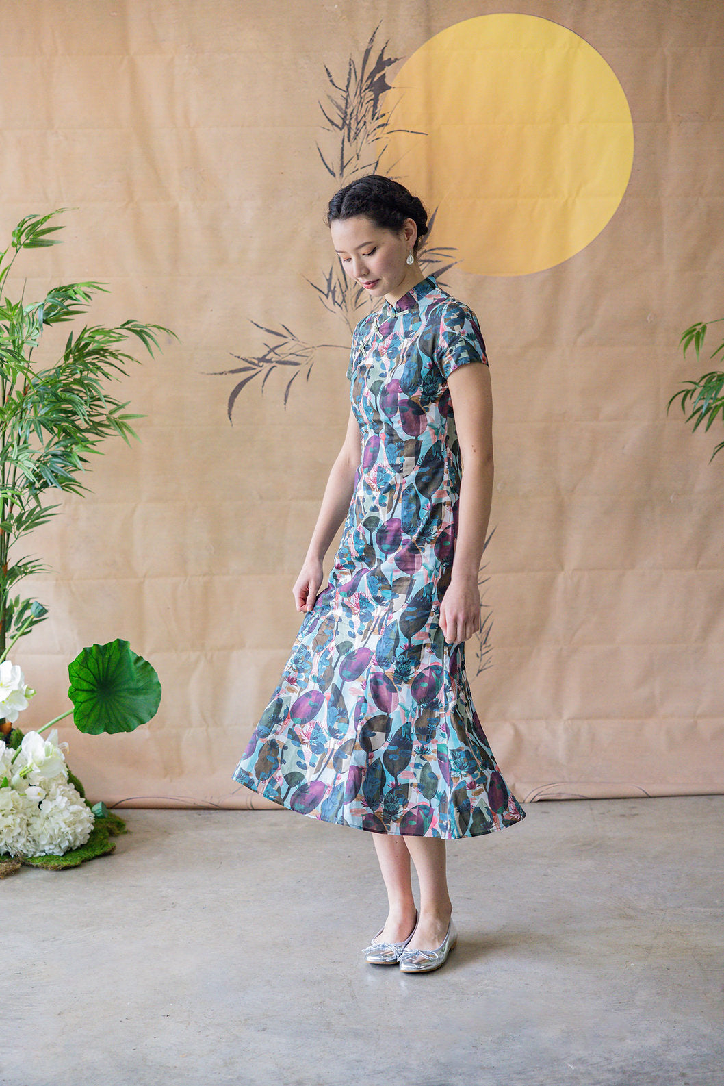 This eye catching lady’s cheongsam is available in three color ways, featuring impeccable handmade Chinese knot button details, small mermaid flare, and a midi lenghth give the piece a glamorous look. Whether for festive gatherings or grand celebrations.