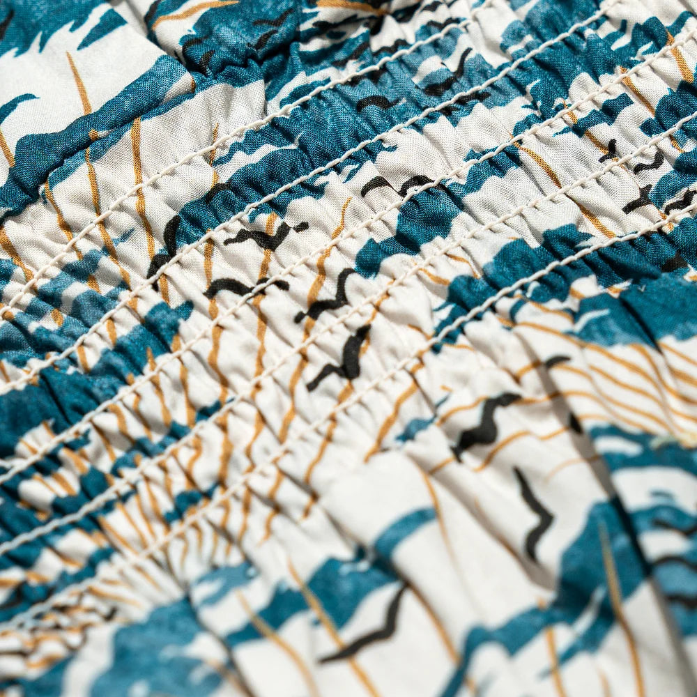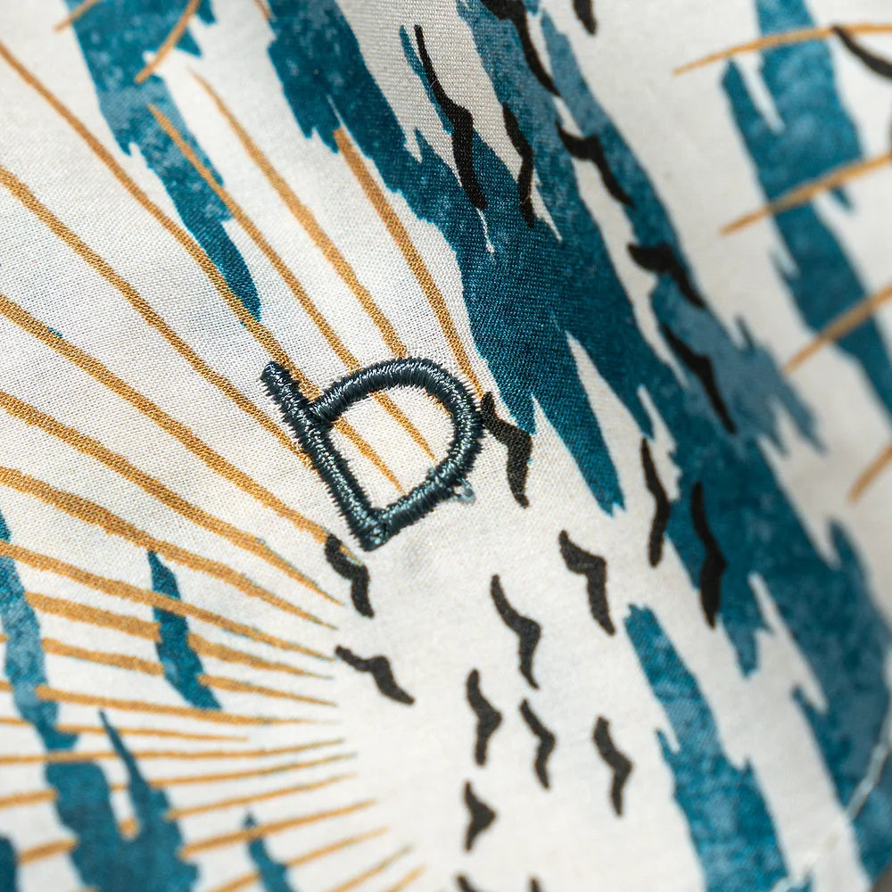 The Ralston print is in a nod to the sun god Helios, depicts billowing clouds warmed by golden sunbeams, stretching outwards into the vastness of the skies to illuminate the horizon. Inspired by a paper impression discovered in the Liberty archive, these imaginary panoramas are observed by birds in flight, all bathed in the dazzling light of dawn. Ralston is part of the Universe story of Liberty London Autumn/Winter 2023 collection - reflecting the enduring symbolic power of stories to explain the world around us, these designs capture a realm of fierce passion and drama.