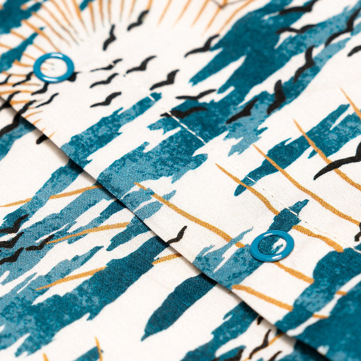 The Ralston print is in a nod to the sun god Helios, depicts billowing clouds warmed by golden sunbeams, stretching outwards into the vastness of the skies to illuminate the horizon. Inspired by a paper impression discovered in the Liberty archive, these imaginary panoramas are observed by birds in flight, all bathed in the dazzling light of dawn. Ralston is part of the Universe story of Liberty London Autumn/Winter 2023 collection - reflecting the enduring symbolic power of stories to explain the world around us, these designs capture a realm of fierce passion and drama.