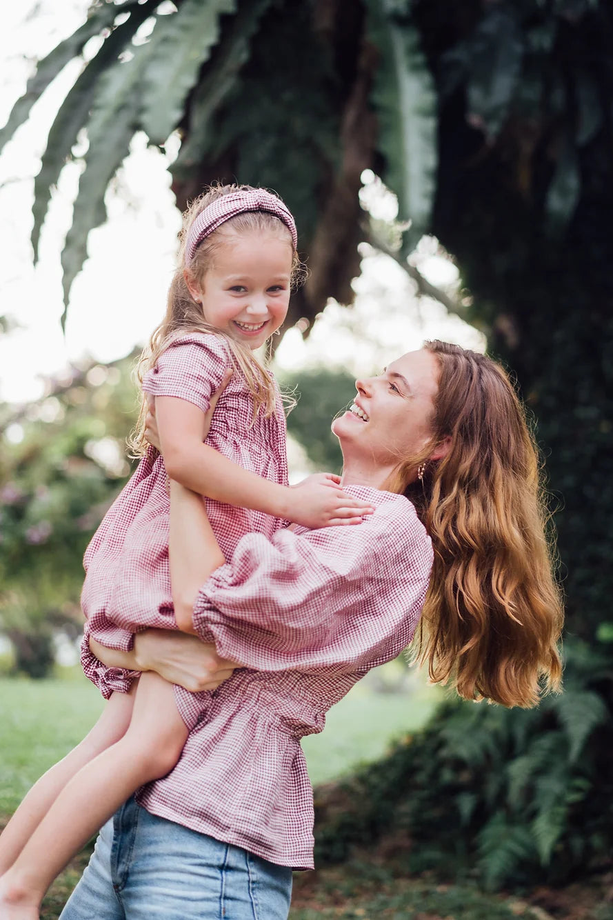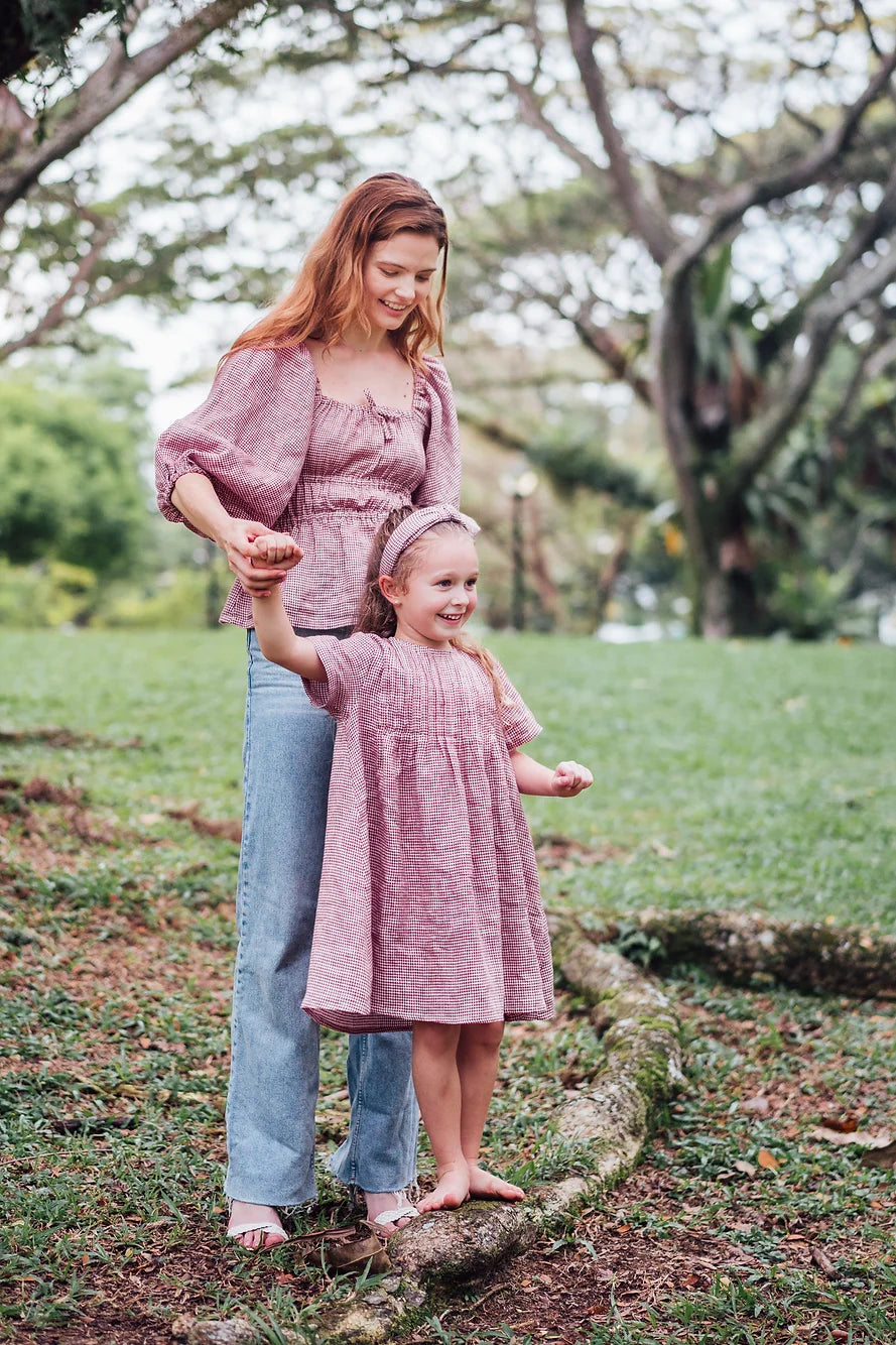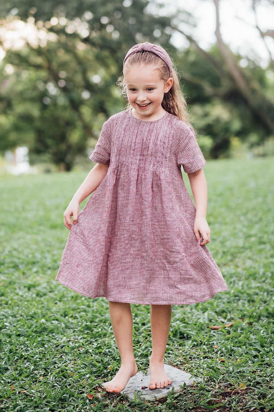 Available in green, blue and red gingham, it also comes with matching hair pieces, and coordinated styles for boys, moms & dads.