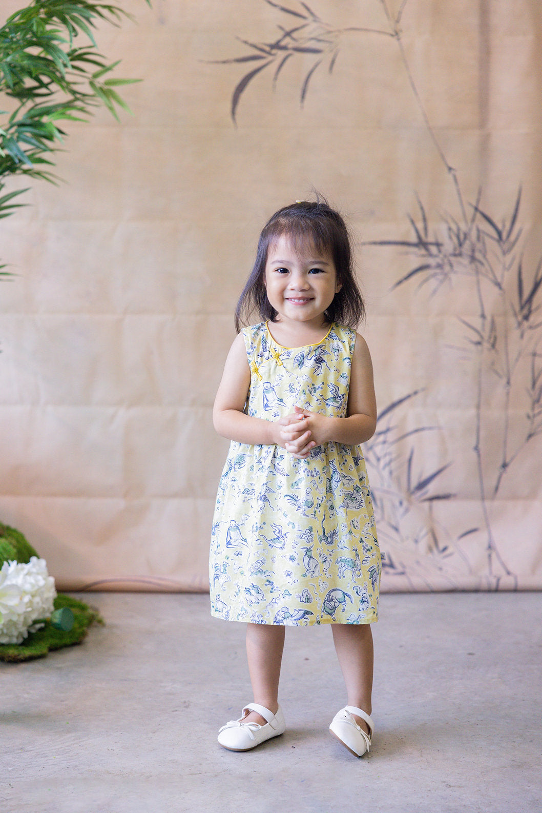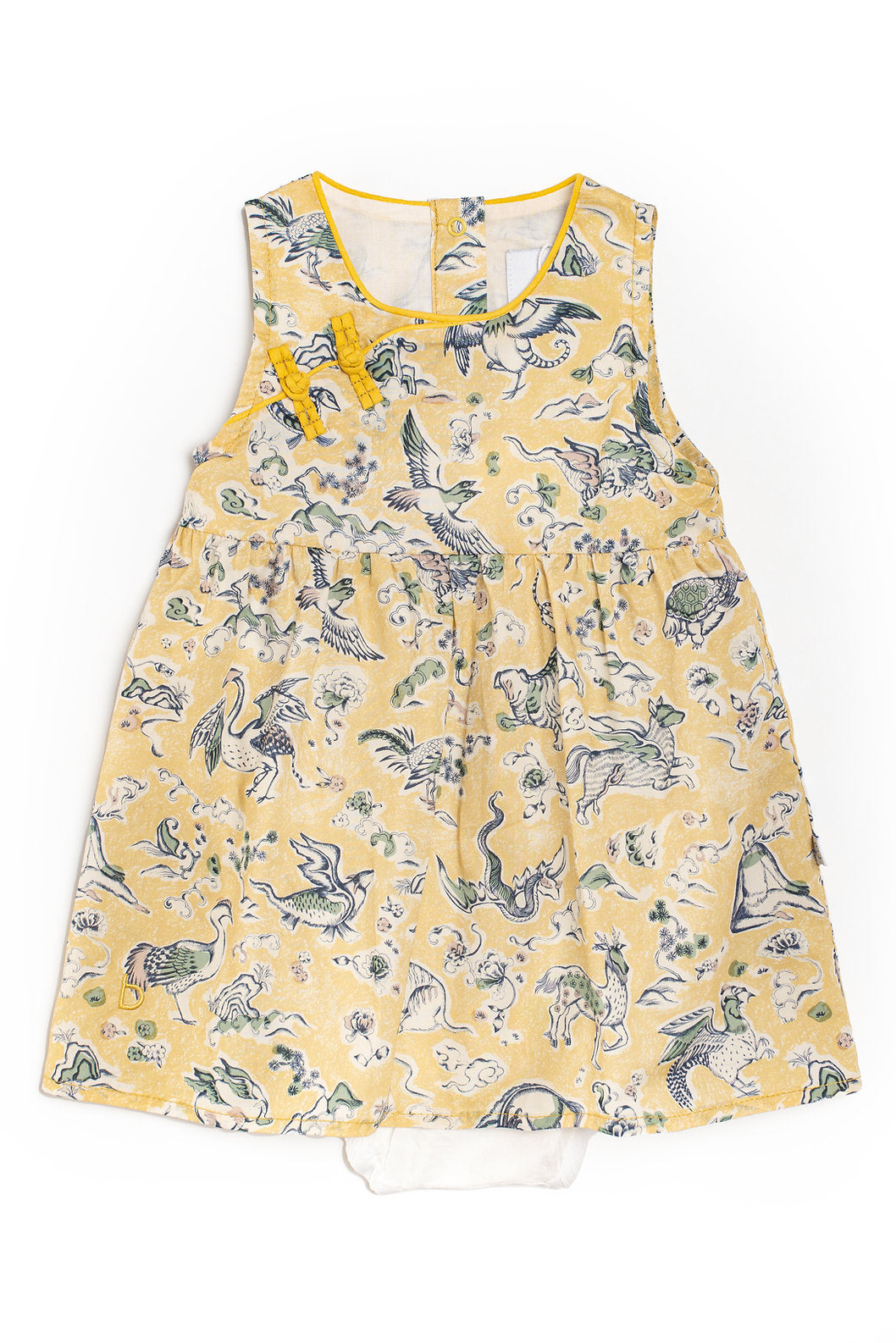 The fully lined onesie dress (dress outside, oneside inside to hide the diapers!), features hand made Chinese knot buttons in the front, opens with snap-buttoned fastenings in the back, perfect for special occassions, or a just feel-like-dressed-up-day.