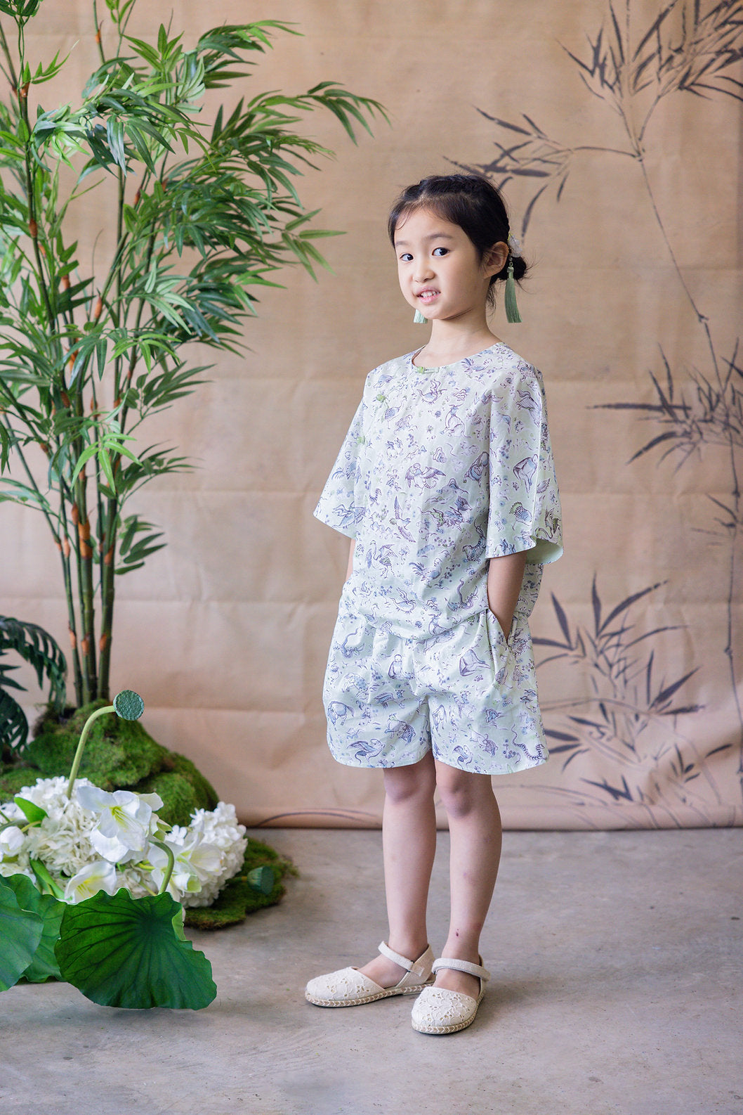Available in yellow, green, and purple, this girl's set combines traditional elegance with modern comfort. Featuring decorative hand-made Chinese knot and crystal round buttons, wide kimono-like sleeves for a cozy and relaxed fit, and shorts with practical pockets, it’s more than just a statement piece - it’s perfect for effortless style and ease on any occasion.