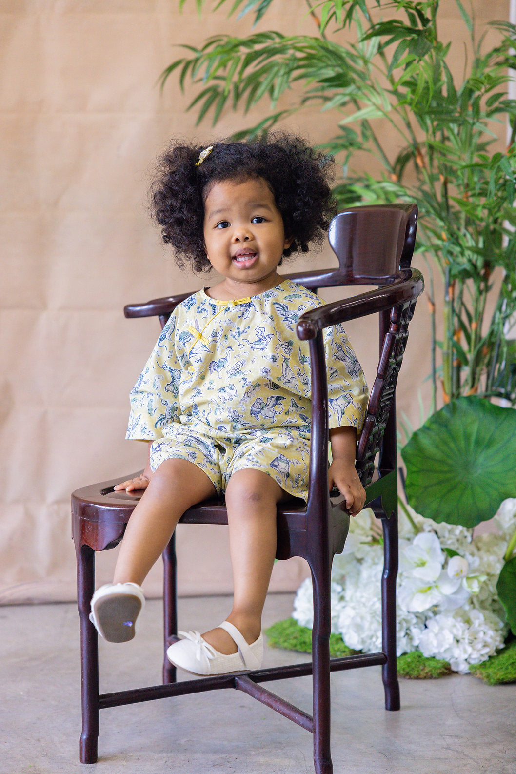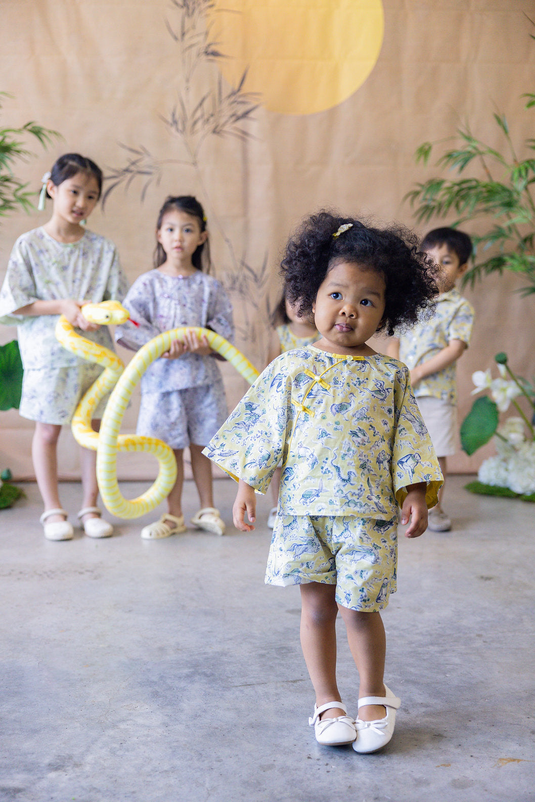 Available in yellow, green, and purple, this girl's set combines traditional elegance with modern comfort. Featuring decorative hand-made Chinese knot and crystal round buttons, wide kimono-like sleeves for a cozy and relaxed fit, and shorts with practical pockets, it’s more than just a statement piece - it’s perfect for effortless style and ease on any occasion.