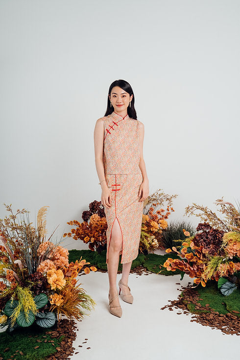 The Naiad set comes with a sleeveless crop top and a matching straight slit skirt, both pieces comes with beautiful hand-mande Chinese knot buttons details.