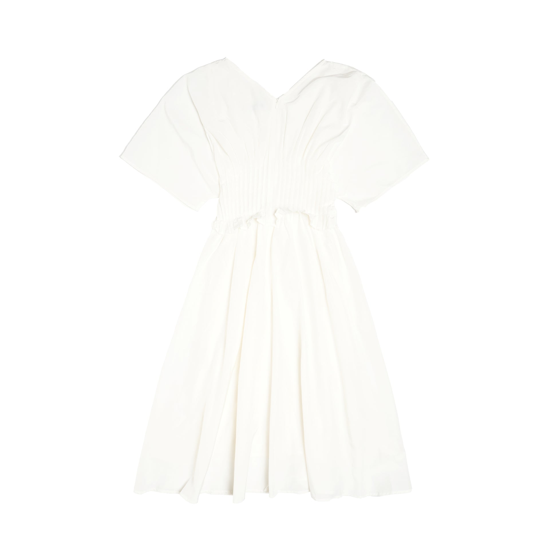 This dress features a flattering V-neckline that elongates the silhouette, while its wide, fluttery flare sleeves exude effortless grace. The handmade pleated bodice design beautifully accentuates curves, adding a refined touch to the dress's flowing A-line cut.