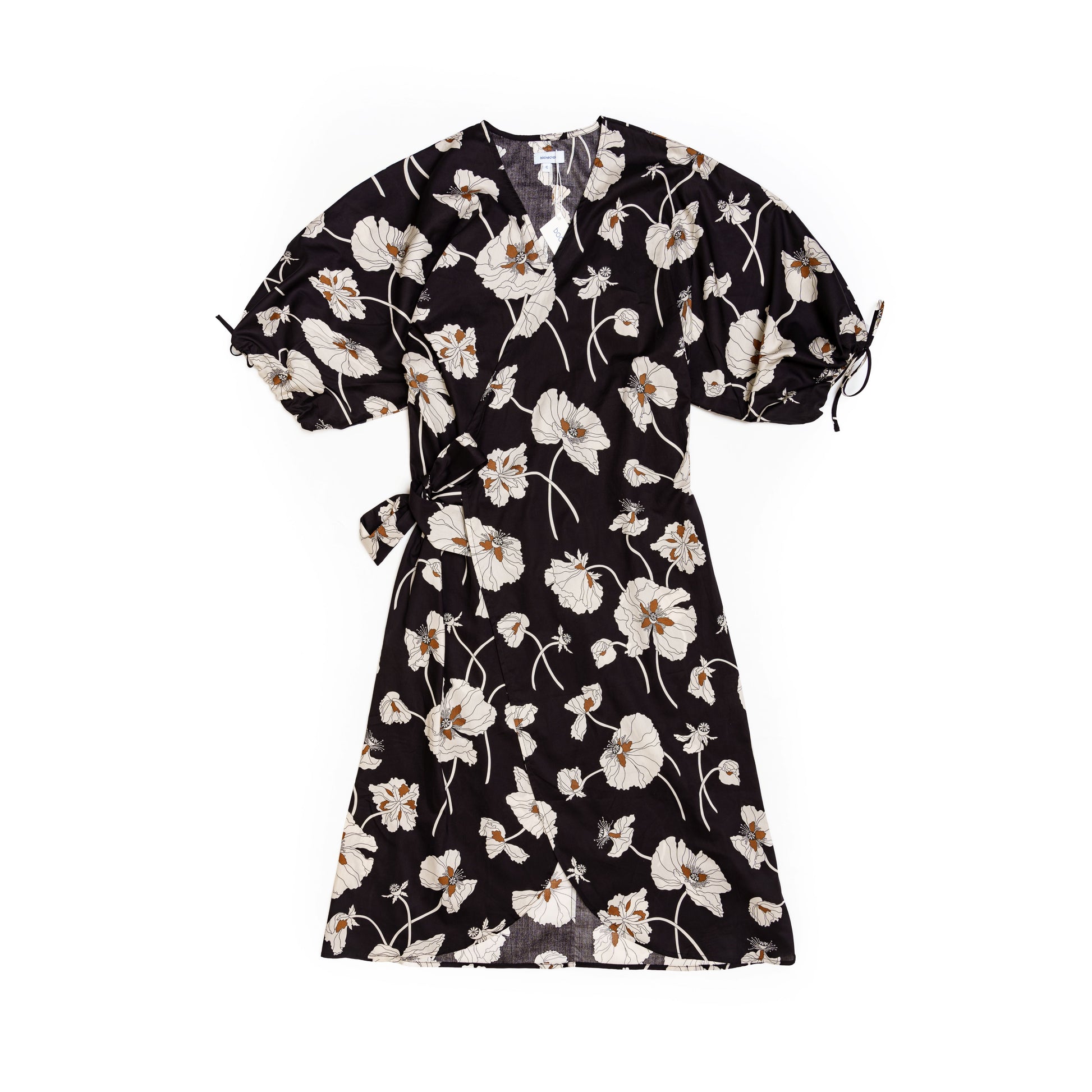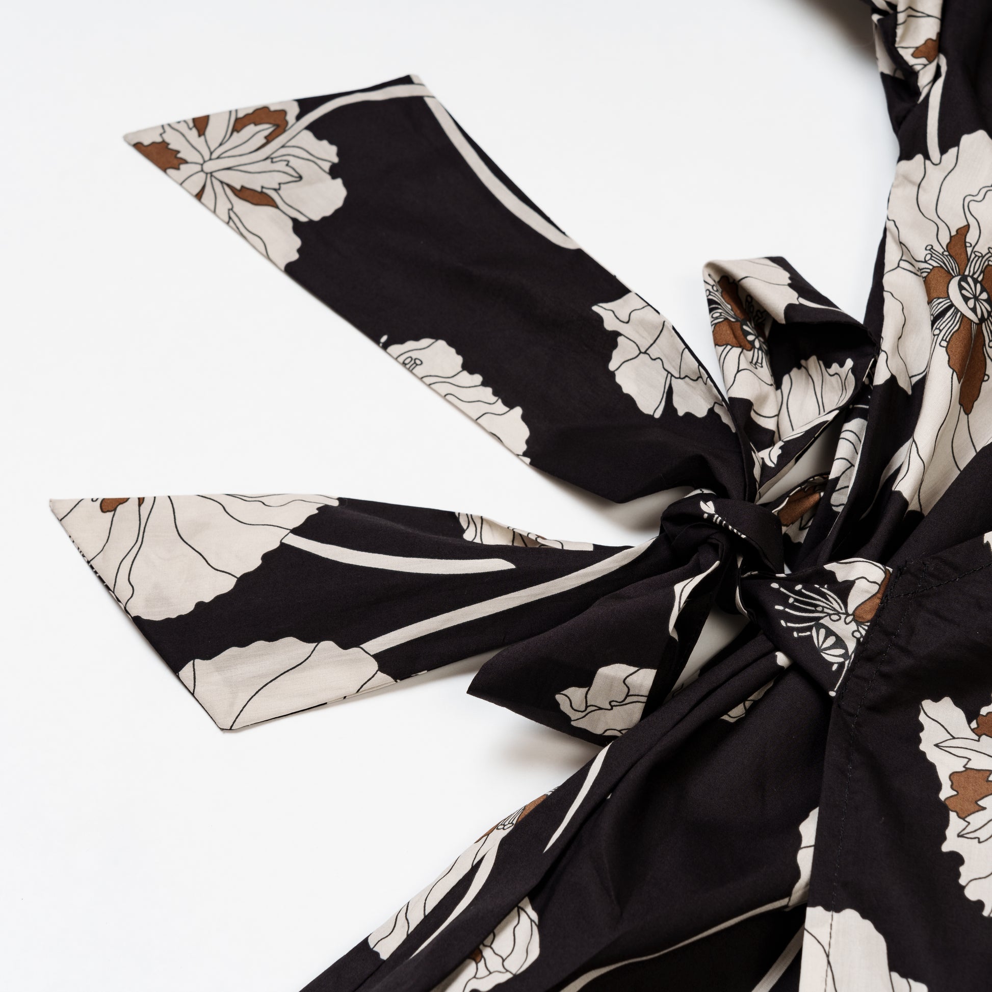 Crafted from Liberty Tana Lawn™ cotton, this kimono-inspired wrap dress blends fluid elegance with a structured silhouette. It features softly gathered sleeves, a wrap tie waist for adjustable comfort, and a midi-length skirt that flatters every movement. A true statement piece for festive gatherings or special occasions.