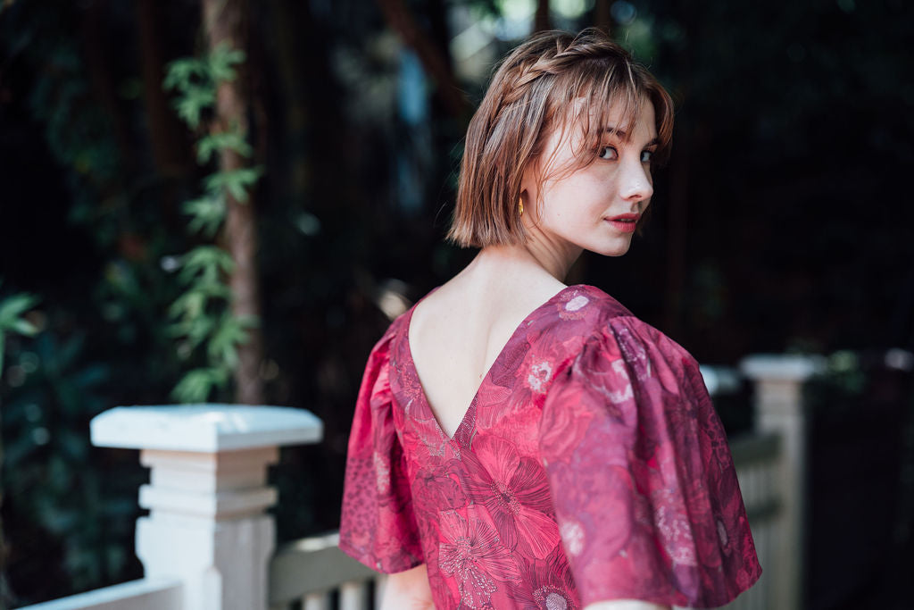 The Rosy Floral dress draws inspiration from our signature Carissa silhouette, featuring a structured yet easy fit with a square neckline, feminine flared sleeves, and a soft V-back. Gentle gathers define the waist to its relaxed A-line silhouette — bold enough to make a statement, yet timeless in its charm.